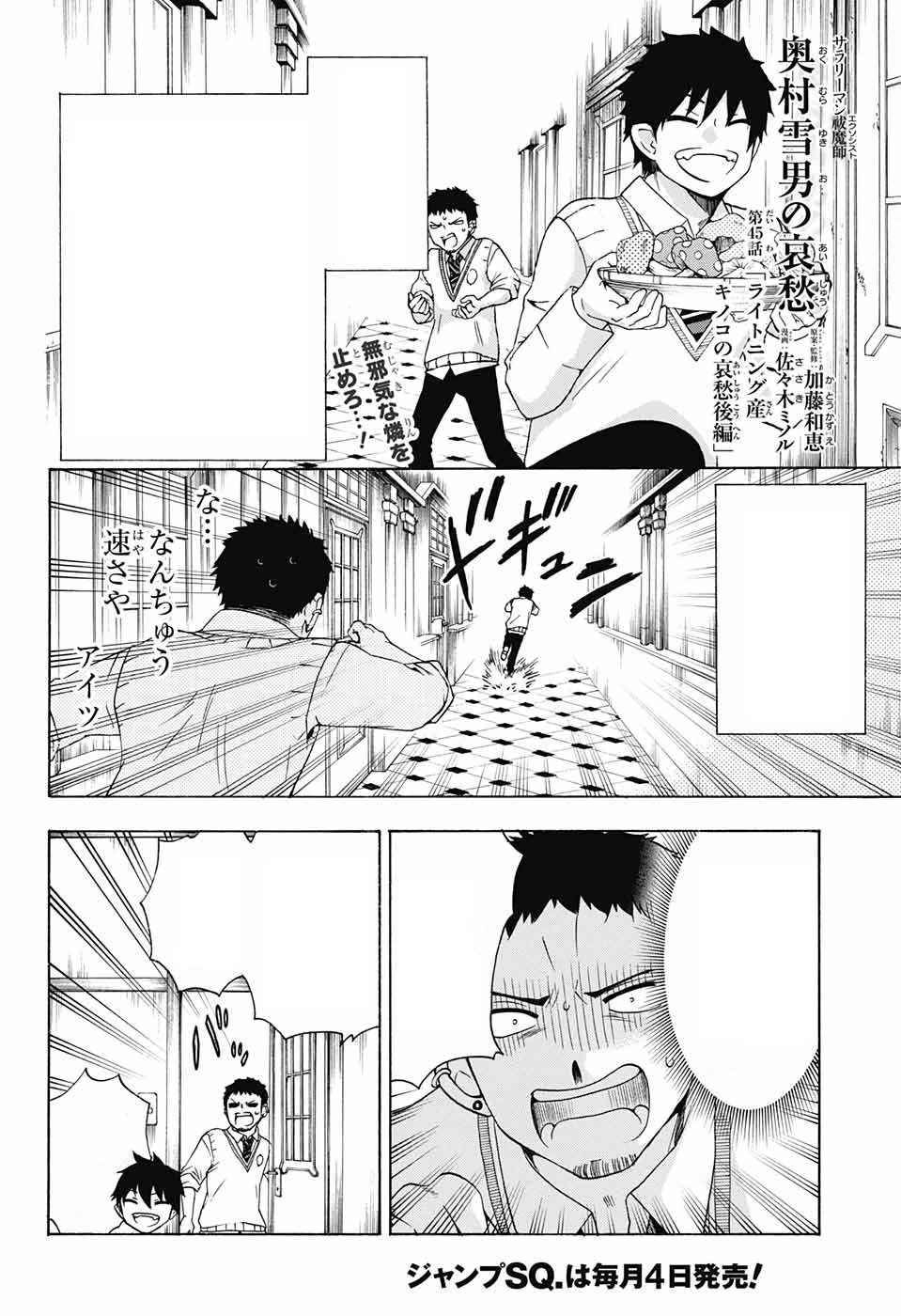 The Sorrows of Lightning's Mushrooms - Sequel (ライトニング産キノコの哀愁 後編Raitoningu-san Kinoko no Aishū - Kōhen) is the 49th serialized chapter of Kazue Katō and Minoru Sasaki's Salaryman Exorcist: The Sorrows of Yukio Okumura. It is a sequel to Chapter 48, The Sorrows of Lightning's Mushrooms (ライトニング産キノコの哀愁Raitoningu-san Kinoko no Aishū).