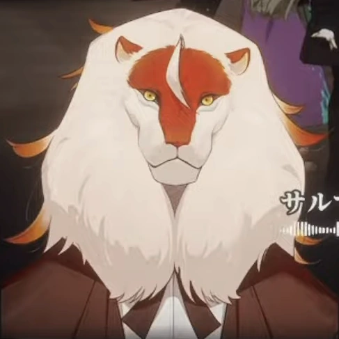 Salmac appears as a demon with a human body and a Lion's head. His body appears to be covered in orange fur and he wears a brown suit and tie with black shoes. He has a large mane of white hair and yellow eyes.